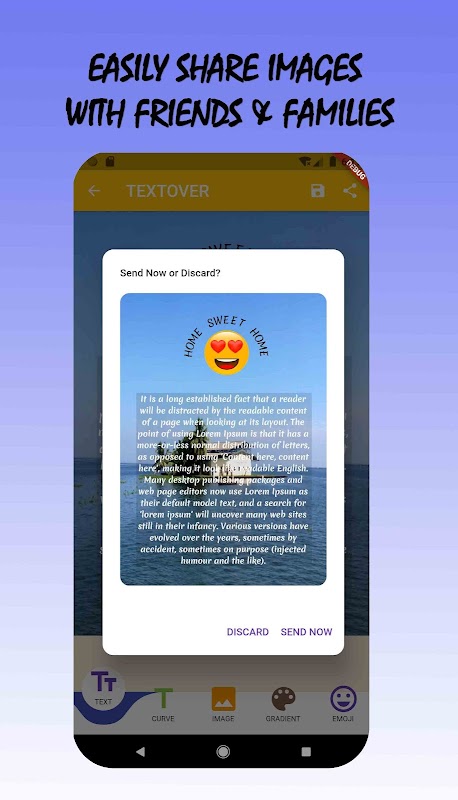 Curvy text over photo is possible and easy with this app. Artistic text can be created and added to photo and images. It equally enables you to create messages with text on photo and share with friends and family on social media. Insert your favorite quotes on photo and image and create typography stickers.