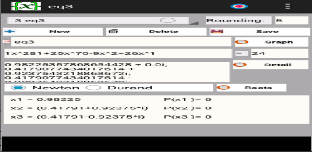 Aplikasi ini memiliki fungsi untuk menunjukkan arti polinomial dalam titik dan menampilkan grafik akar dalam bidang kompleks.