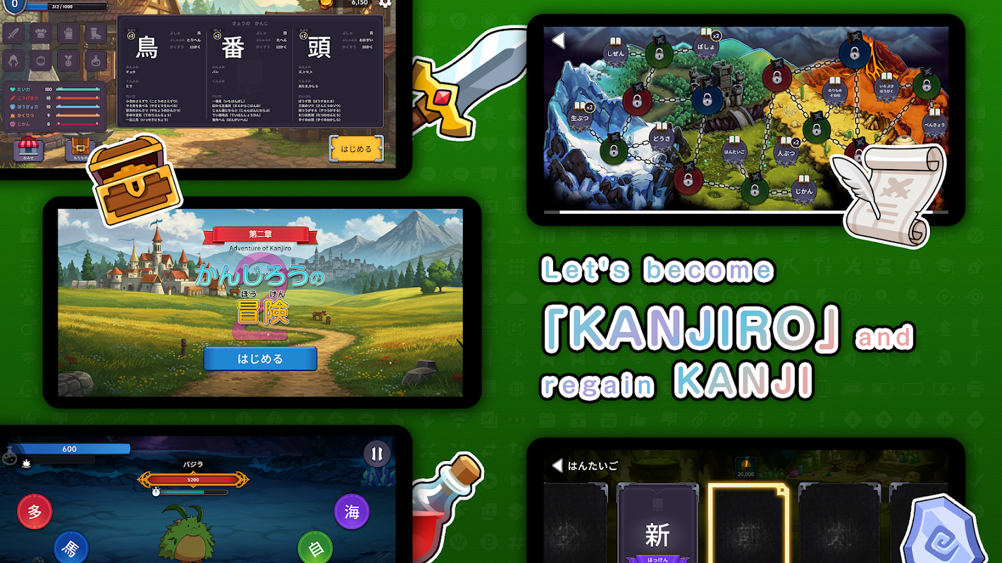 Anda menjadi karakter utama, Kanjiro, dan memulai pencarian untuk menemukan kanji yang dicuri monster dengan menulis kanji, mencarinya, dan mengidentifikasi bacaannya. Menemukan kanji memungkinkan Anda naik level dan mendapatkan koin.