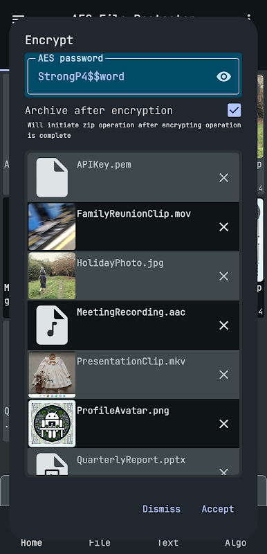 AES File Protector — solusi tepercaya Anda untuk mengenkripsi file, teks, foto, video, dan lainnya. Dengan kekuatan enkripsi AES-256, aplikasi ini memudahkan pengamanan data Anda, baik bagi para penggemar maupun profesional.