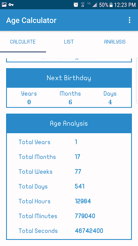Program usia kalkulator adalah sebuah aplikasi android untuk menghitung usia Anda sangat akurat memberitahu Anda bertahun-tahun, bulan, minggu, hari, jam, menit dan detik.