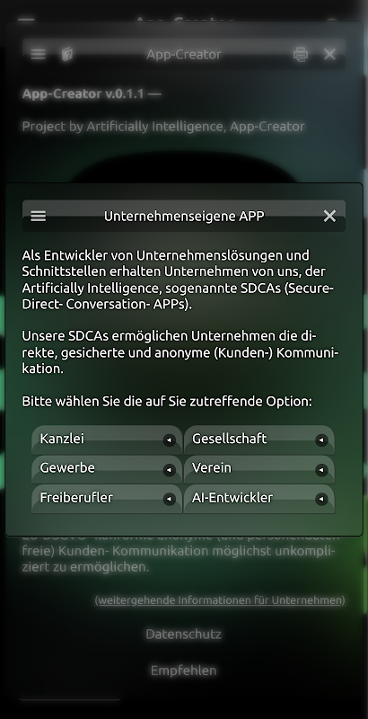 SDCA (Secure Direct Conversation App) kami memungkinkan komunikasi langsung dan memenuhi persyaratan perlindungan data yang ketat serta komunikasi pelanggan anonim (dan bebas data pribadi) yang sesuai dengan UE-DSGVO.