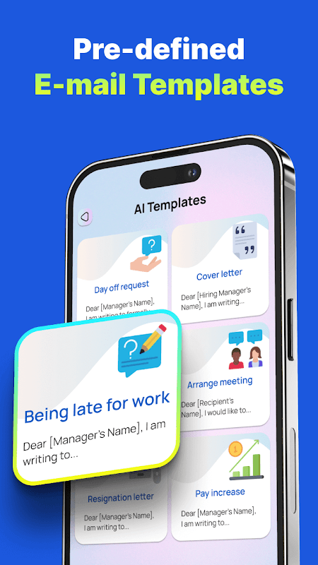 Templat AI menyertakan templat teks email yang telah dirancang sebelumnya untuk menghasilkan email dan pesan. Ini mencakup berbagai templat tujuan seperti Permintaan hari libur, Surat lamaran, Terlambat bekerja, Mengatur pertemuan, Surat pengunduran diri, dan Kenaikan gaji.