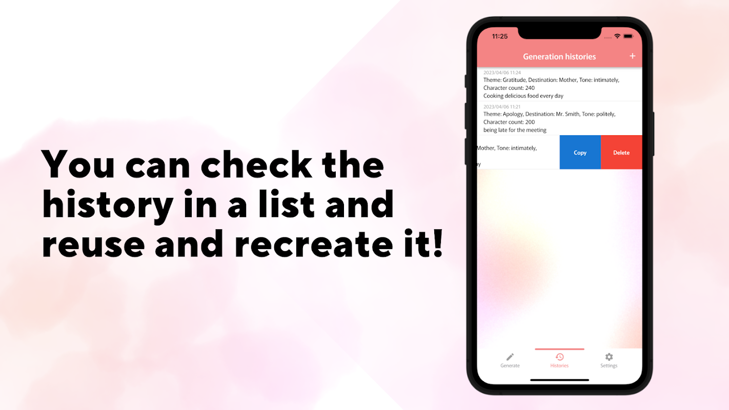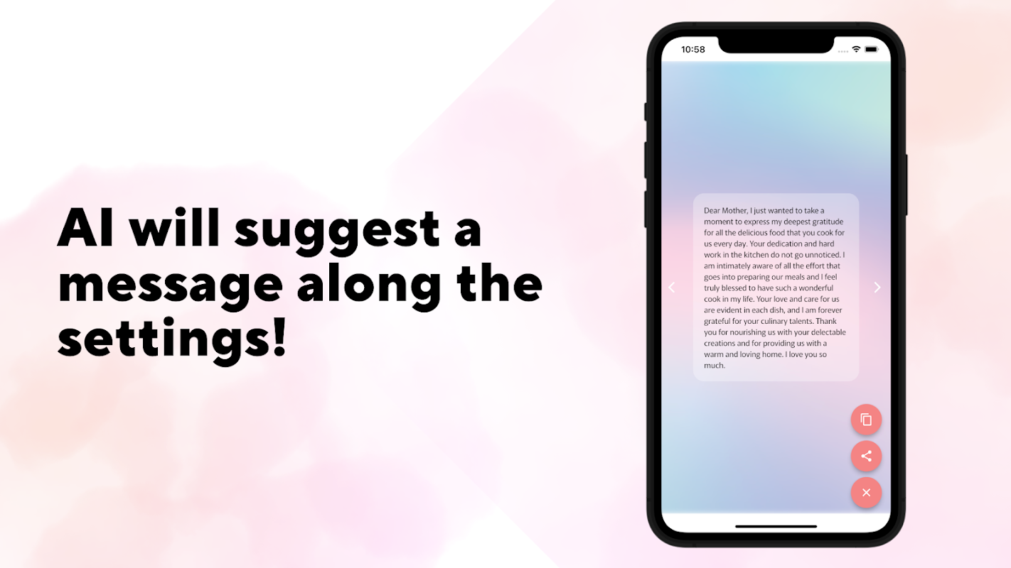 Hanya dengan mengatur tema, penerima, konten, tone, dan jumlah karakter, pesan yang dibuat oleh AI akan tercipta.