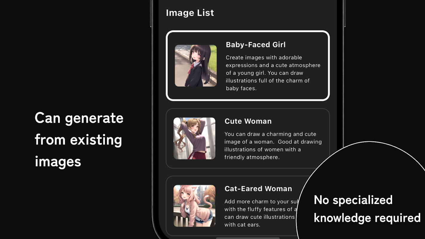 Mudah Digunakan: Tidak diperlukan pengaturan rumit atau penulisan cepat. Cukup pilih elemen favorit Anda dari opsi pilihan dan buat karakter dengan mudah.