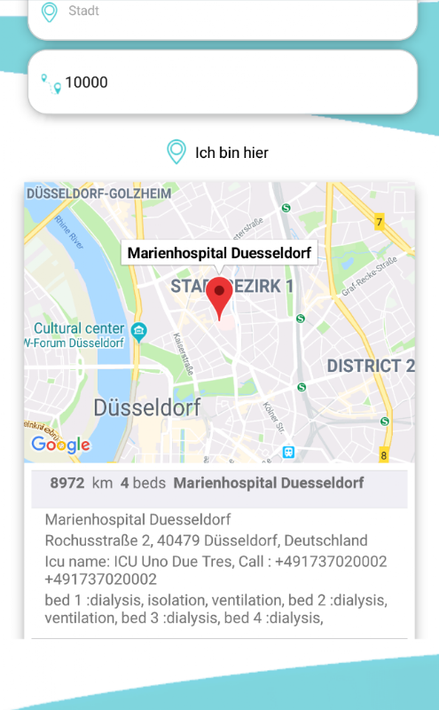 Pengguna dapat mencari rumah sakit dengan tiga bidang "Pilih jenis tempat tidur", "Kota / Negara", Radius di seluruh dunia.