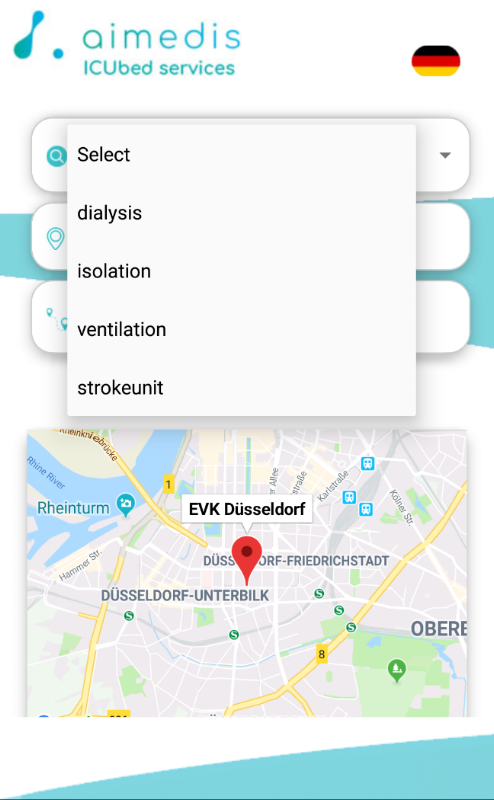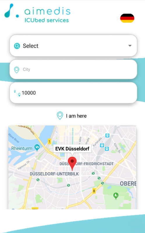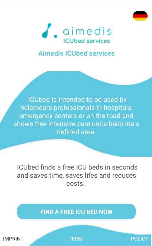 Aimedis ICU bed search engine. Pengguna dapat menemukan semua daftar Rumah Sakit. Radius diatur 10 km pada awalnya. Lokasi pengguna dan Lokasi Rumah Sakit akan ditandai di peta. Ketika pengguna akan membuka aplikasi, lokasi saat ini akan ditampilkan, dan mencari dengan radius 10 km.