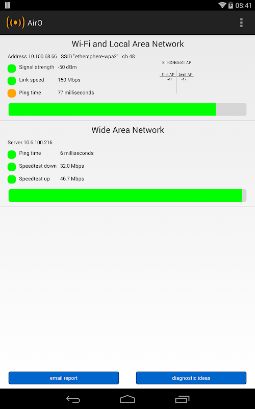 AirO ditujukan untuk pemilik perangkat Android berkemampuan Wi-Fi teknis dan tidak terlalu teknis. Ini menampilkan kesehatan koneksi Wi-Fi (“Local Area”), dan mengukur karakteristik koneksi “Wide Area” ke server yang lebih dalam di jaringan. Dapat digunakan untuk menjawab pertanyaan seperti:
