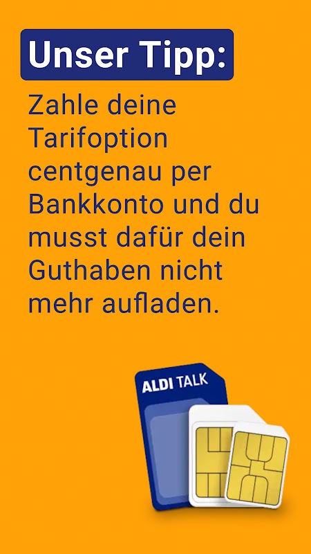 Instal sekarang dan gunakan secara langsung. Fungsi dasar tersedia langsung untuk Anda. Untuk alasan keamanan, berbagai fungsi dapat dilakukan setelah membuat akun pelanggan ALDI TALK. Di bawah MeinAldiTalk.de Anda dapat membuat ini gratis dan cepat.