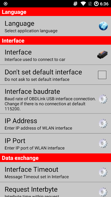Untuk detail konfigurasi koneksi ke antarmuka dan mobil lihat bantuan aplikasi yang tersedia di http://www.alfaobd.com/AlfaOBD_Android_Help.pdf