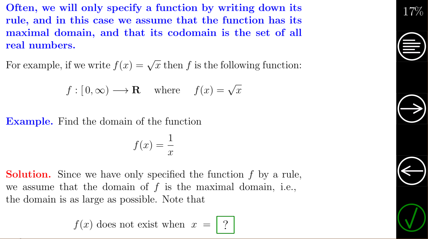 Kebanyakan kursus Aljabar (seperti ini) adalah persiapan untuk kursus Kalkulus, jadi kita juga melihat definisi Kalkulus yang khas dari suatu fungsi di mana fungsi tersebut hanya ditentukan oleh sebuah aturan. Domain kemudian merupakan himpunan bagian terbesar dari himpunan semua bilangan real yang sesuai dengan aturan fungsi, dan kodomain adalah himpunan semua bilangan real.