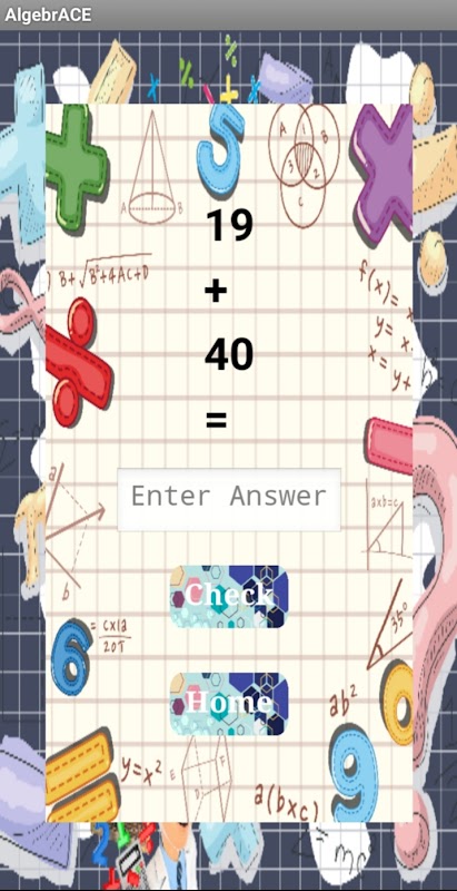 Menampilkan desain yang bersih dan visual yang dinamis, AlgebrACE menawarkan platform yang ramah pengguna di mana anak-anak dapat dengan mudah terlibat dengan tantangan numerik. Aplikasi ini menyajikan serangkaian soal matematika, mendorong anak-anak untuk menyelesaikannya dengan memasukkan jawaban yang benar. Format sederhana ini memungkinkan anak-anak berkonsentrasi hanya untuk mengasah keterampilan aritmatika mereka tanpa gangguan apa pun.