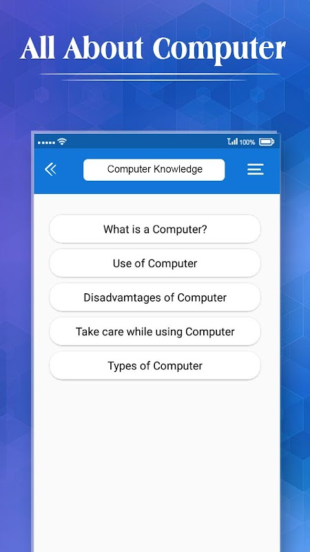 All About Computer app will help you increase your computer knowledge. Using this app you will be able to learn how to use a computer. This app includes basic information about computer operations. Also in this app various computer parts related information is included.