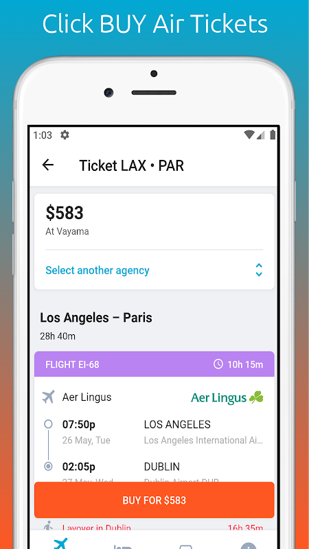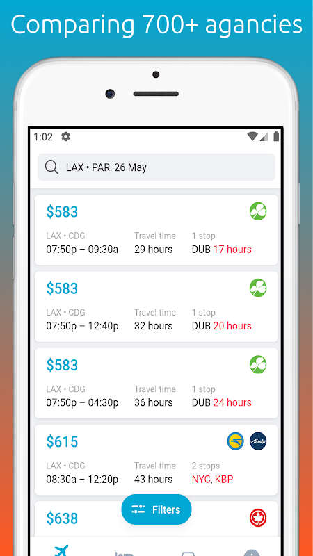 Hal pertama yang harus dilakukan untuk menemukan Cheapflights adalah menelusuri aplikasi kami. Pilih titik tujuan, tanggal keberangkatan dan kepulangan, lalu Anda hanya perlu menunggu satu detik atau kurang hingga Anda menerima hasilnya. Aplikasi mitra Aviasales akan secara otomatis menemukan tiket pesawat murah terbaik hanya dalam beberapa detik.
