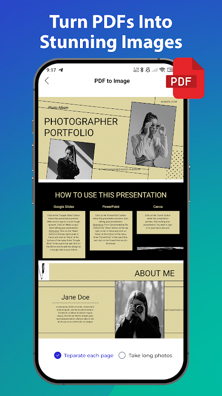 • PDF ke Gambar – ekspor halaman yang dipilih ke JPG/PNG untuk dibagikan atau dicetak
