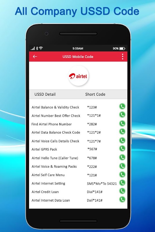 All Network USSD Codes App will help to find out the USSD Mobile Codes for All Mobile operators in India. Also this application can works without internet so you can access all USSD codes even if you are not connected to the internet.