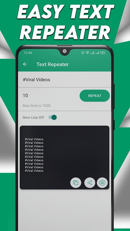 • Mudah untuk menghasilkan teks berulang dan membaginya dengan teman. Anda dapat mengulangi teks apa pun seribu kali hanya untuk menulis sekali menggunakan pengulang teks.