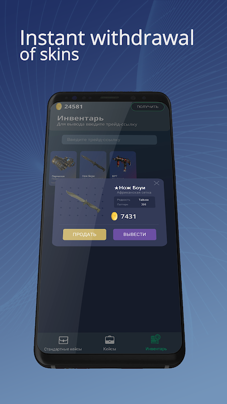 Welcome to AllCases! This is a new multiplayer cs go case in real time. Collect rare weapons, open chests, compete with other players! Don't wait any longer - choose a case and open it, and then bring your skins to your inventory! The application does not require your login and passwords. Download AllCases and try your luck right now!