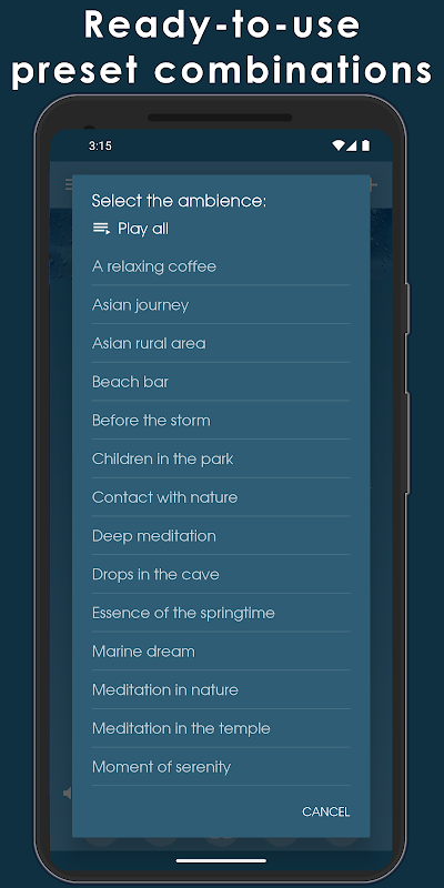 Didesain dengan antarmuka pengguna yang interaktif dan intuitif, aplikasi ini memungkinkan Anda membuat dan memadukan suasana Anda sendiri. Anda dapat menyimpan kombinasi suara sebanyak yang Anda suka dan memutarnya kapan pun Anda belajar, berjalan pulang, membaca, dan bahkan saat bersiap untuk tidur (timer dalam aplikasi dapat disetel untuk memungkinkan penghentian otomatis setiap kali Anda tertidur).