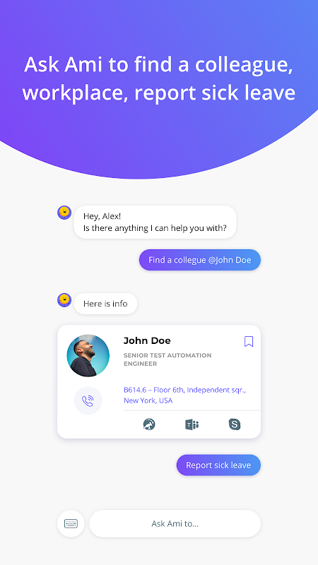 Ami simplifies your corporate routine by giving you the fastest way to send requests from regular office issue to getting contact info of your colleague on the go.