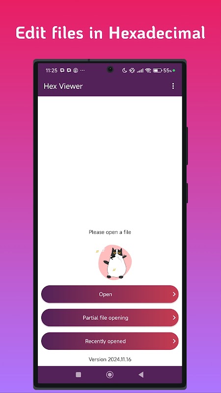 😁 Akses File Universal: Buka file apa pun di perangkat Anda, bahkan yang tidak memiliki aplikasi terkait. 😁 Tampilan Heksadesimal & Teks Biasa: Menampilkan konten file dalam format heksadesimal atau sebagai teks biasa.