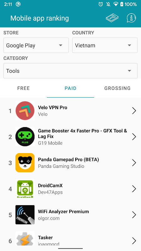 - Help you get the list of trending applications in any country for each category