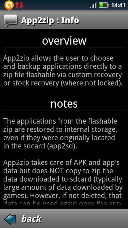 App2zip is in very early stage, does NOT work on some devices, so please first of all make a test to see if it works for you (e.g. backup an app you don't care much, uninstall it and restore back via CWM recovery). Use at your own risk!