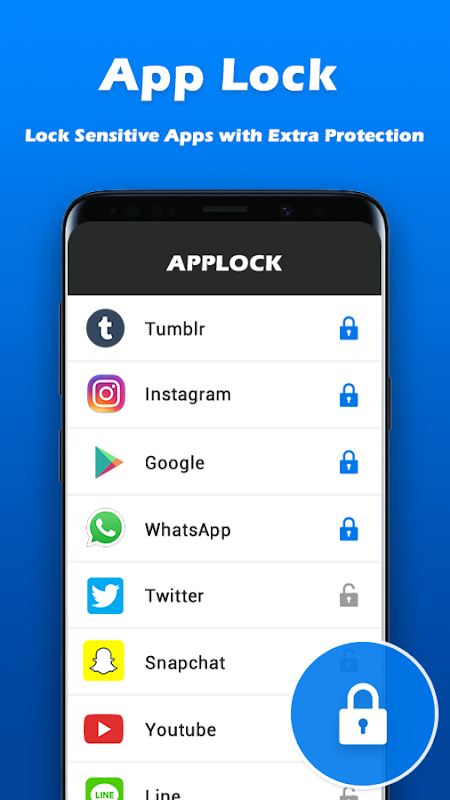 Aplikasi sosial kunci AppLock. AppLock dapat mengunci Facebook, WhatsApp, Instagram, Tumblr, Messenger, Line, dan Twitter dan sebagainya. Tidak perlu khawatir tentang kebocoran privasi. Pastikan keamanan!