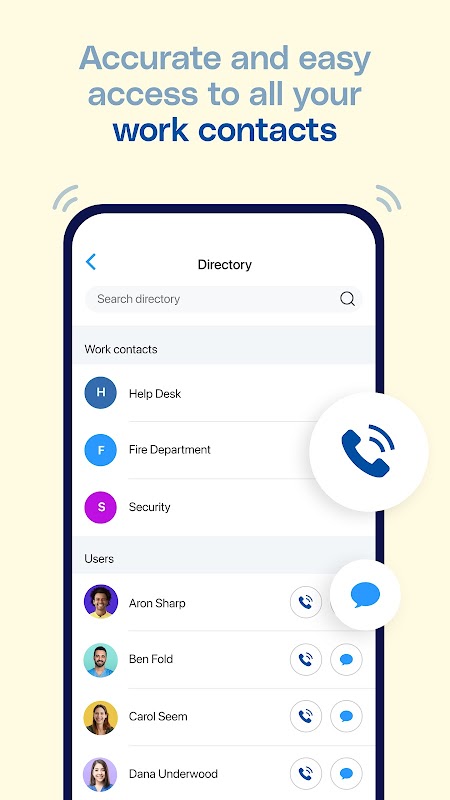 • Log panggilan - ID Penelepon untuk mengenali panggilan dari kontak kantor Anda