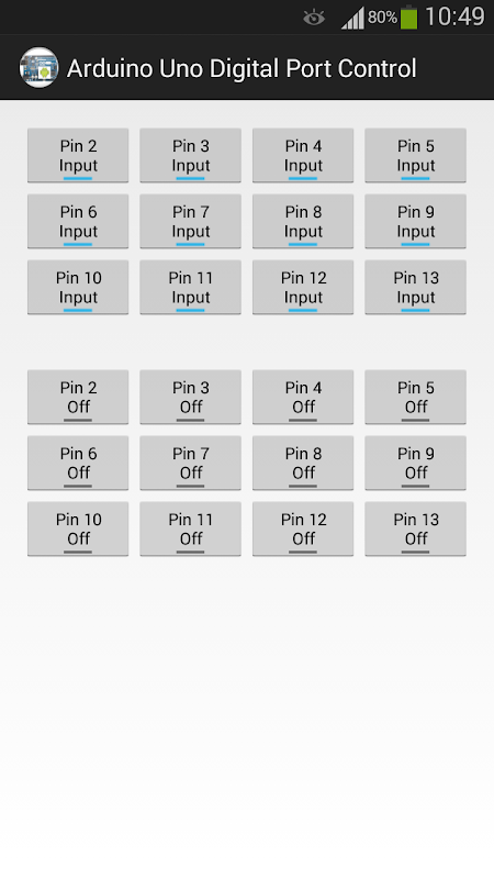 Aplikasi ini memungkinkan untuk mengontrol digital I / O port dari Arduino papan mikrokontroler UNO melalui antarmuka USB dari perangkat Android Anda. Yang Anda butuhkan adalah sebuah kabel USB OTG dan kabel USB yang tepat untuk sambungan. Melalui antarmuka pengguna, Anda dapat membuat pin digital INPUT atau OUTPUT dan mengontrol NEGARA LOGIC setiap pin dengan tombol beralih dengan mudah.