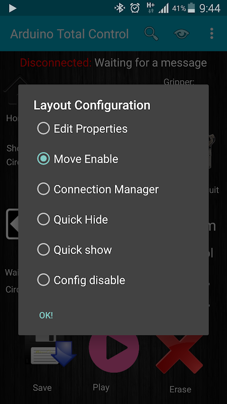 Thanks to your feedback and support, Arduino Total Control now can be fully customized. You can manage the layout as you like the most! Just enable "Edit properties" form the menu to hide/show buttons, text or images, then, keep your finger (long click) on the picture in order to change the displayed image, and choose one from your gallery or take a shot.