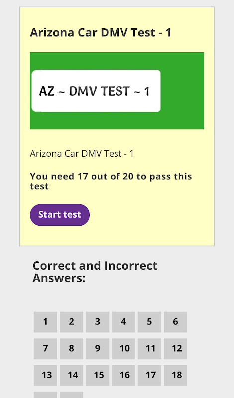 In this app Every test have 20 questions you need 17 Marks to pass.