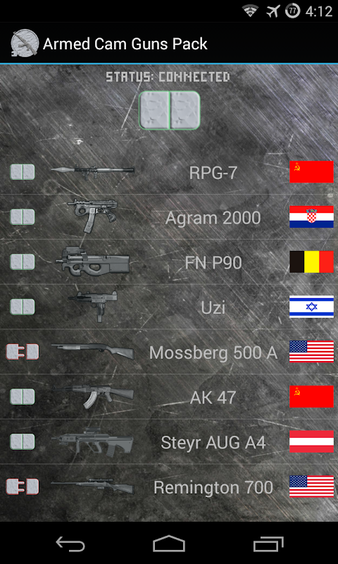 When app start just tap on icon above a textview of status to connect all guns to Armed Cam. Then if you want to exclude some weapon tap on it otherwise tap to connect. When Gun Pack is connected it not appear in applications menu of device. To access app you can start it directly from Armed Cam in "weapon map" menu.