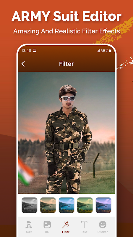 Editor setelan tentara India untuk anak perempuan dan laki-laki adalah salah satu aplikasi smartphone terbaik yang memiliki lebih dari 50 setelan militer pria dan juga setelan tentara wanita India juga disediakan. Editor setelan foto pakaian tentara pria adalah salah satu aplikasi bingkai foto polisi India terbaik.