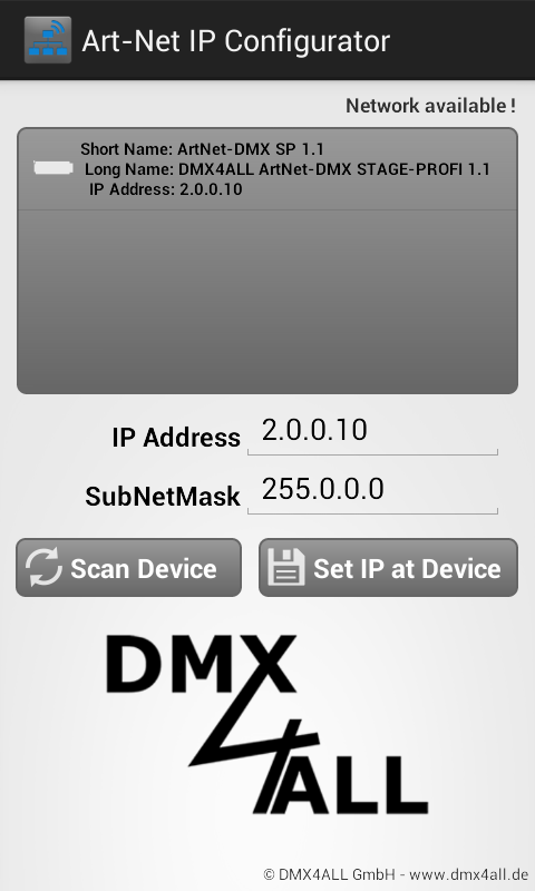 Der Art-Net IP-Configurator ermöglicht die Einstellung der IP-Adresse und der SubnetMask von beliebigen Art-Net Geräten (*).
