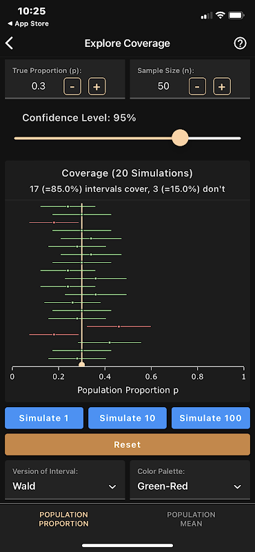 Aplikasi ini juga memiliki modul khusus untuk mengeksplorasi konsep seperti probabilitas cakupan untuk interval kepercayaan atau konsep kesalahan dan kekuatan Tipe I & II. Itu benar-benar dapat menemukan kesalahan dan kekuatan Tipe II untuk pengujian proporsi (dan pengujian tertentu untuk sarana.)