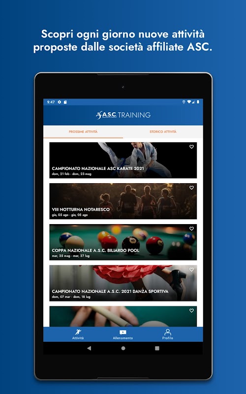 L’applicazione permette di visualizzare le attività sportive disponibili sia svolte all’interno di strutture o all’aperto in presenza sia svolte online.