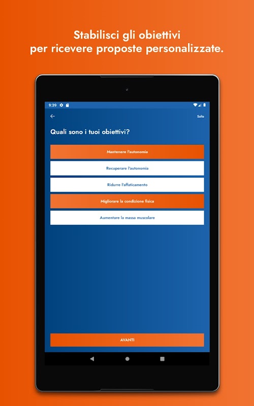 L’utente attraverso la registrazione iniziale ha modo di effettuare un test di base per stabilire obiettivi, forma fisica, discipline e provincia geografica di riferimento.