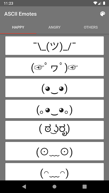 ASCII Emotes adalah aplikasi ringan yang berisi daftar emotikon ASCII. Untuk menyalin emoticon cukup sentuh emoticon pilihan Anda dan secara otomatis akan ditambahkan ke clipboard Anda.