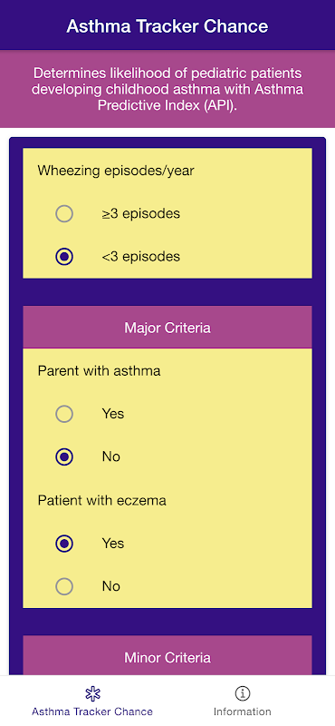"Pelacak Asma Kesempatan - Indeks Prediktif Asma" adalah aplikasi seluler medis yang dirancang untuk membantu praktisi kesehatan atau dokter anak untuk menentukan kemungkinan berkembangnya asma masa kanak-kanak pada pasien berusia kurang dari 3 tahun. Aplikasi "Pelacak Asma - Indeks Prediktif Asma" didasarkan pada kriteria ketat dan kriteria longgar. Kriteria yang ketat untuk indeks prediktif asma akan digunakan untuk anak-anak dengan lebih dari 3 episode mengi per tahun. Sedangkan kriteria longgar akan digunakan untuk anak dengan episode mengi kurang dari 3 pertahun.