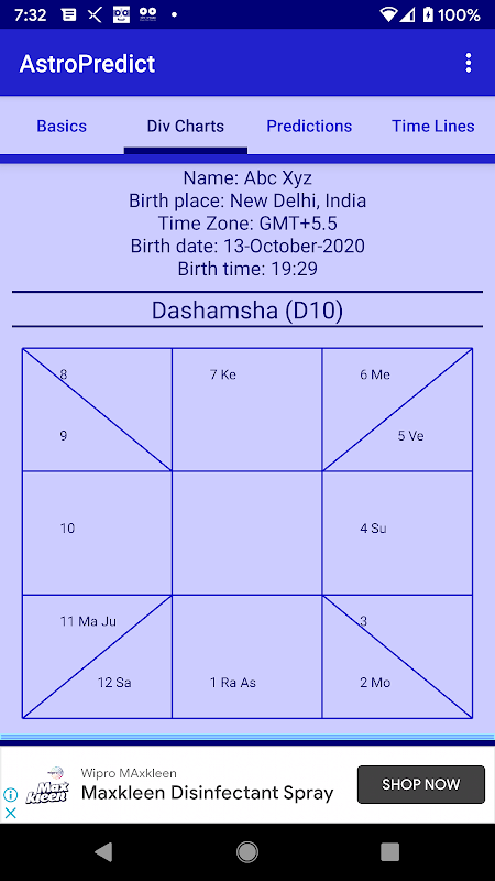Aplikasi ini akan menampilkan horoskop Anda, grafik divisi, prediksi umum dan prediksi berdasarkan garis waktu. Ramalan umum antara lain ramalan tentang diri sendiri, kesehatan, kekayaan, pendidikan, profesi, pernikahan dll.