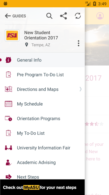 The ASU Guide application allows you to access pre-event and post-event information, directions, information about campus services, and to build your own schedule for the events you want to attend.