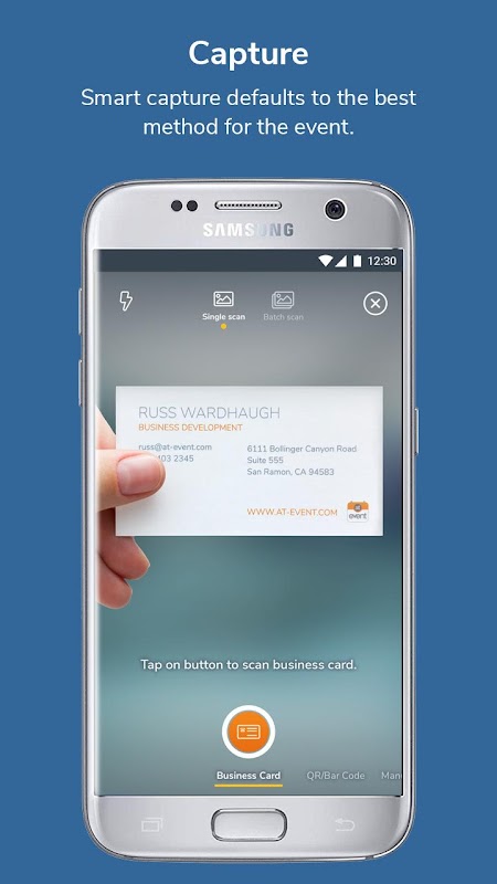- Capture: Scan business cards and badges, check in pre-registered attendees, or add manually.