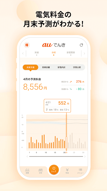 Aplikasi yang harus dimiliki oleh pengguna au Denki! Nyaman untuk memeriksa tagihan listrik harian Anda dan menghemat energi!