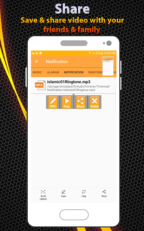 Audio & Video Editor is an amazing Ringtone maker free ringtone/alarm/notification from mp3 or aac file and so on by customer demands. This Audio & Video Editor has exceptional properties like Audio conversion wav to mp3 alteration, wma to mp3, m4a to mp3, mp3/wav/wma/m4a to aac conversion and Audio extraction extract mp3 from mp4, flv, MKV and many more video formats.