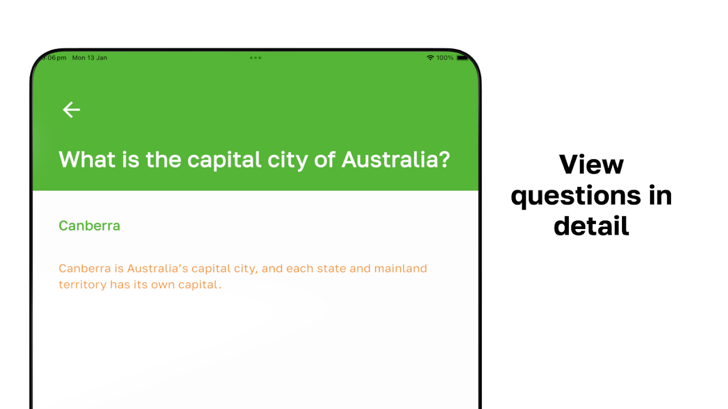 Aplikasi kami menampilkan soal-soal latihan terkini yang mencakup sejarah, pemerintahan, budaya, dan nilai-nilai Australia, bersama dengan penjelasan terperinci untuk sebagian besar pertanyaan untuk membantu Anda memahami mengapa jawaban yang benar adalah pilihan terbaik.