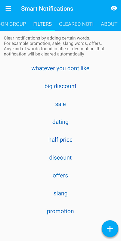 Anda dapat menghapus notifikasi berdasarkan nama aplikasi atau grup ikon aplikasi (fitur unik) atau dengan memfilter kata-kata.