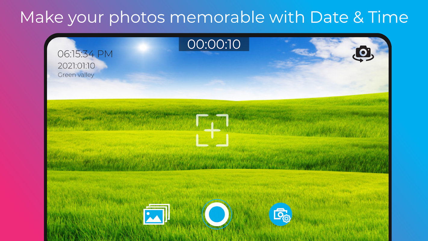 - Kamera gratis ke cap waktu untuk mengingat tanggal dan waktu setiap gambar yang Anda ambil