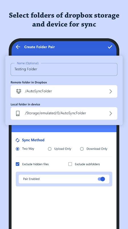 You just need select the Dropbox folder and local device folder for sync. You can also set your sync method – Two-way, Upload Only, and Download Only. You can also set sync file preference – exclude hidden files and exclude subfolders.