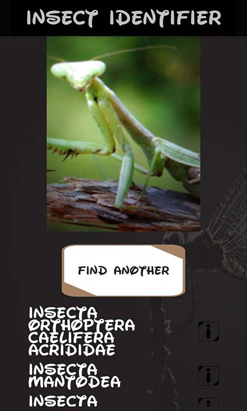 Dengan mengambil foto atau foto yang dibuat sebelumnya Anda dapat mengetahui jenis serangga apa itu, akan muncul klasifikasi dengan lima nama ilmiah yang paling mirip, dengan menekan tombol yang sesuai Anda dapat langsung mencari semua informasi di internet.